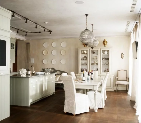 Кухня и столовая совмещены. Вся мебель в помещении белого цвета, а островной гарнитур – цвета «слоновая кость».