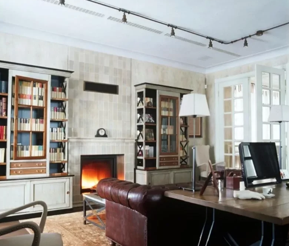 Кабинет Леонида Ярмольника выдержан в лаконичном и сдержанном стиле. Деревянный стол с металлическим каркасом стоит напротив биокамина на портале. По бокам от биокамина стоят книжные шкафы.