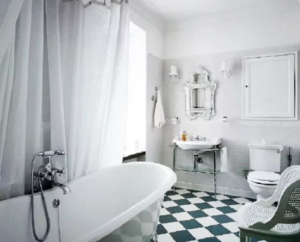 На полу в белоснежной ванной выложена черно-белая плитка по прототипу шахматной доски.