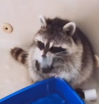 Енот пьет из чашечки