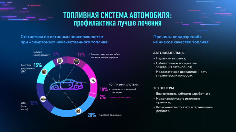 Здесь есть важный лайфхак: если вы подозреваете, что попали в такую ситуацию, — посмотрите по сторонам. На крупной заправке за час заливаются сотни автомобилей — если проблема только у вас, искать ее причины стоит не в топливе, а под капотом собственного авто. Как уточняет Виталий Лисин, по статистике СибАДИ из всех неполадок, демонстрирующих симптоматику некачественного бензина или дизеля, только 2% на самом деле связаны с топливом на последней заправке. В остальных случаях истинной причиной могут быть факторы от сбоя в электронике до накопившегося естественного атмосферного конденсата при нерегулярном обслуживании топливной системы и езде на полупустом баке.