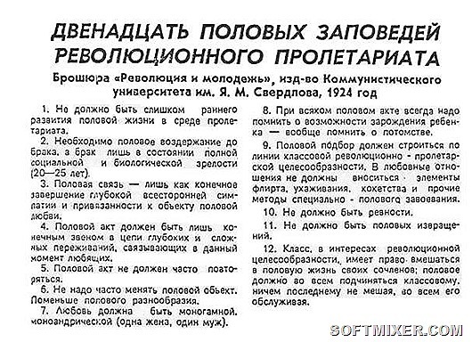 В студенческие годы мне довелось познакомиться с забавной брошюрой Арона Борисовича Залкинда «Революция и молодежь», изданной в 1924 году. В ней этот видный педолог (была в те времена такая наука - педология) выделил «двенадцать половых заповедей революционного пролетариата». Чтиво это чрезвычайно забавное. Приведу пару цитат из вводной части: