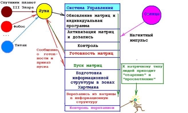 Обновление матриц – это сложный процесс, согласованный со всеми исполнителями: Луна, Солнце, спутники планет, Система Управления. Всё подчинено общей программе. В 2000 году была завершена 500 – летняя программа, разрекламированная Нострадамусом (ему было записано то, что дозволено было разгласить). Цель Программы была достигнута и она полностью завершена. Период 2000-2008 годы – переходный период и закачка новой программы, по которой в Систему Управления поступает информация, как со спутников, так и с Луны. По этой информации все матрицы изымаются, и производится их обновление. Существует ли биоструктура под матрицу, роли не играет. Если биоструктура была и больше не отвечает требованиям программы, она уничтожается и создаётся новая. Обновление производится последовательно, группами. После контроля новой группы старая подлежит уничтожению, при этом проверка на биоструктуре не производится. Так, если в это время у биоструктуры провели операцию (да ещё и удалили что-либо), то при контроле будет утерян идентификационный признак и биоструктура преобразуется в робота. При формировании новой матрицы производится контроль циклической последовательности прохождения действий.