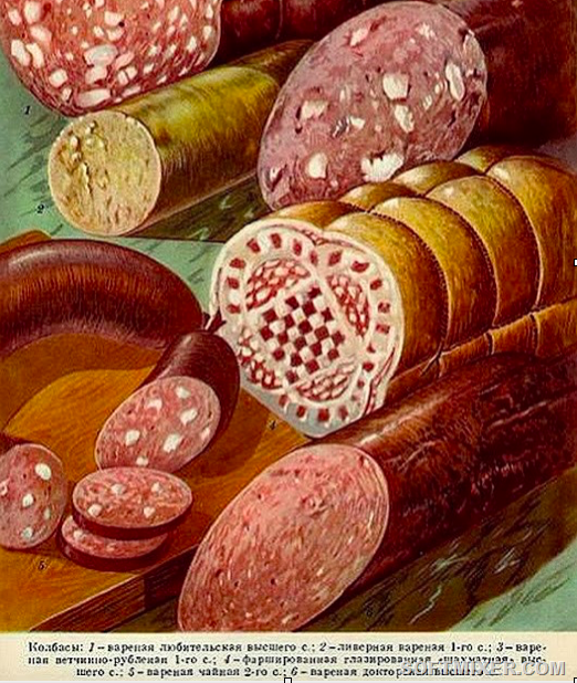 В конце 50-х колбаса в СССР стала одним из главных составляющих мясного рациона: в магазинах было множество сортов недорогих советских колбас.