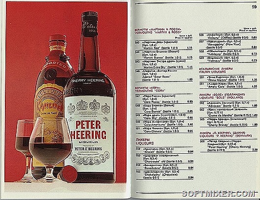 «…Имеется широкий выбор советских и импортных товаров: русский водки и настойки, шотландские виски английские джины, коньяки (…) французские».