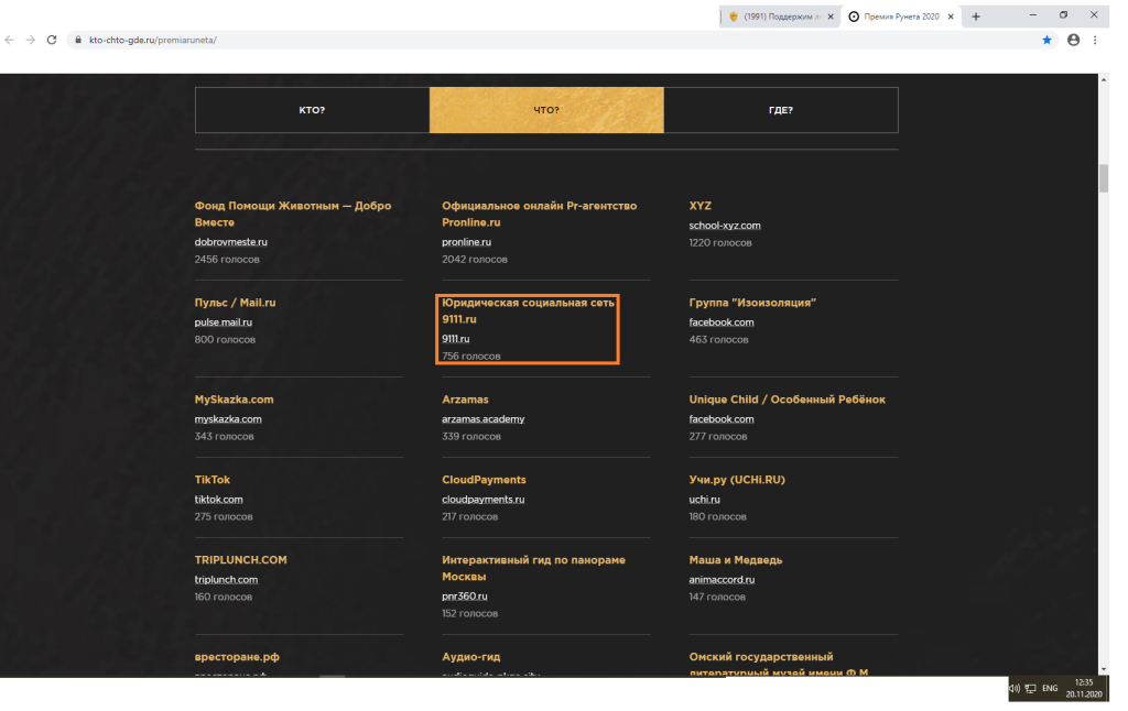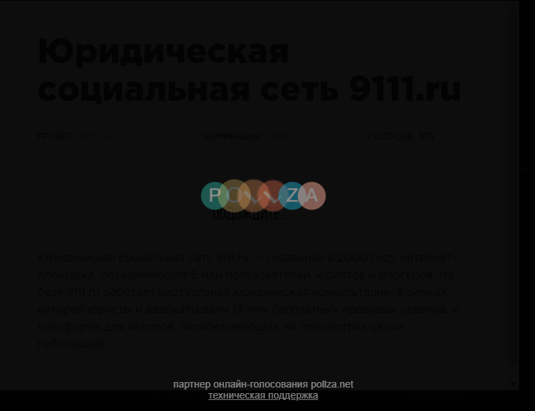 Нужно войти в рубрику «ЧТО?», найти Юридическую социальную сеть 9111.ru и нажать на кнопку ПРОГОЛОСОВАТЬ.