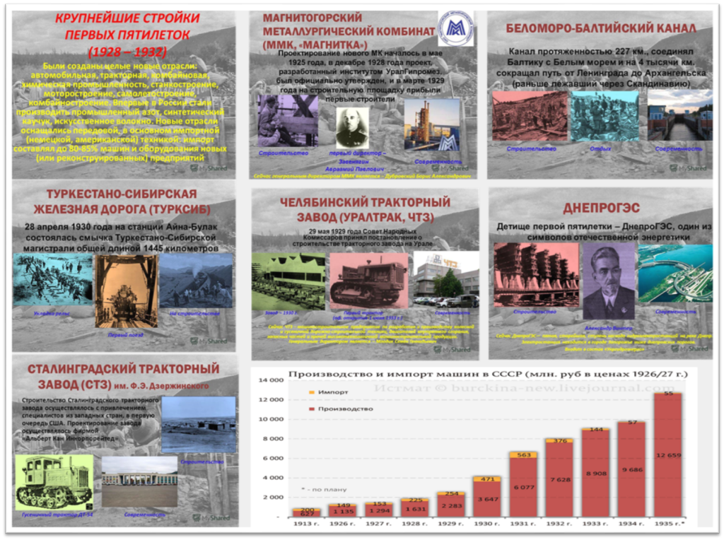 Построены тракторные заводы в городах: Сталинград, Челябинск, Харьков, Нижний Тагил (Уралвагонзавод), построены автомобильные заводы: ГАЗ, ЗИС.