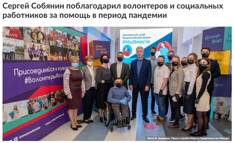 Члены волонтёрского штаба Москвы сфотографировались вместе с мэром. Снимок появился на сайте Сергея Собянина и тут же перекочевал в соцсети. На фотографии все в масках и перчатках, кроме человека, который это правило ввёл.