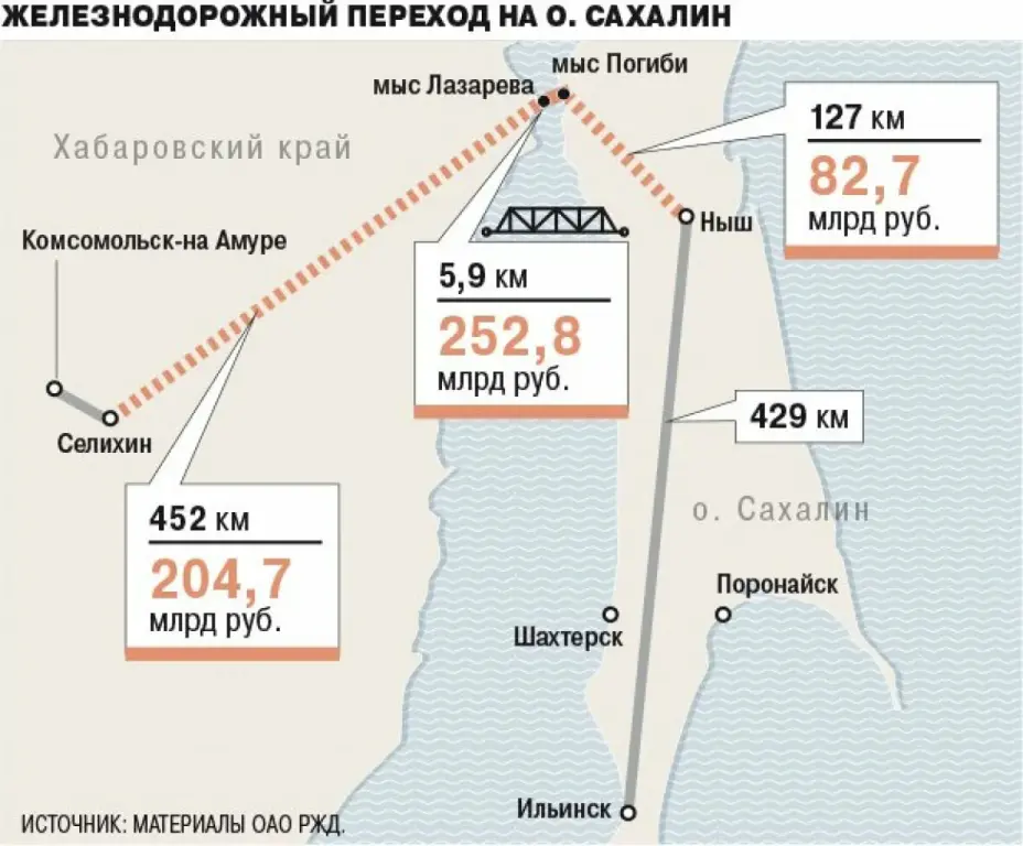 С грузовой базой проекта также все очень сложно. Для того, чтобы окупить строительство в обозримой перспективе (30 лет) грузовая база попросту отсутствует. Единственный товар, который можно возить бесперебойно - это уголь. Однако в этом случае необходимо делать крюк на север Сахалина и, затем, на юг к портам острова. Это существенно удорожает строительство. Куда выгоднее везти уголь сразу на порты Хабаровского или же Приморского края.