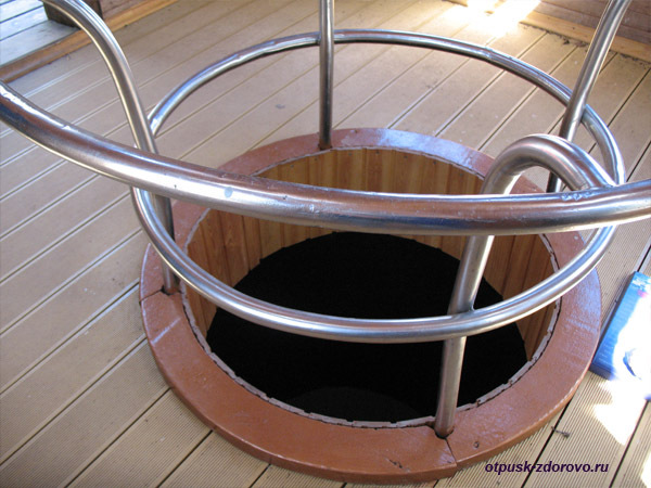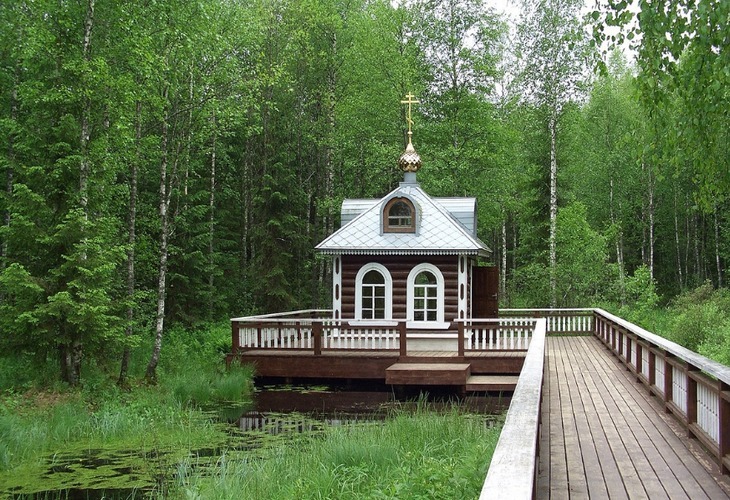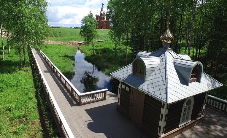 Водоем окружает небольшая часовня, к которой проложен мостик.