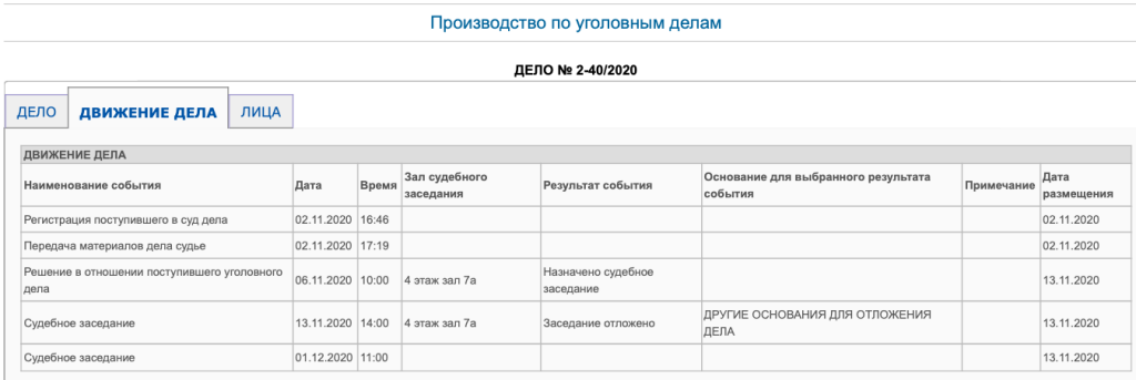 Первое судебное заседание по делу было назначено на пятницу, 13 ноября, но было отложено. Следующее заседание суда назначено на 1 декабря 2020 года.