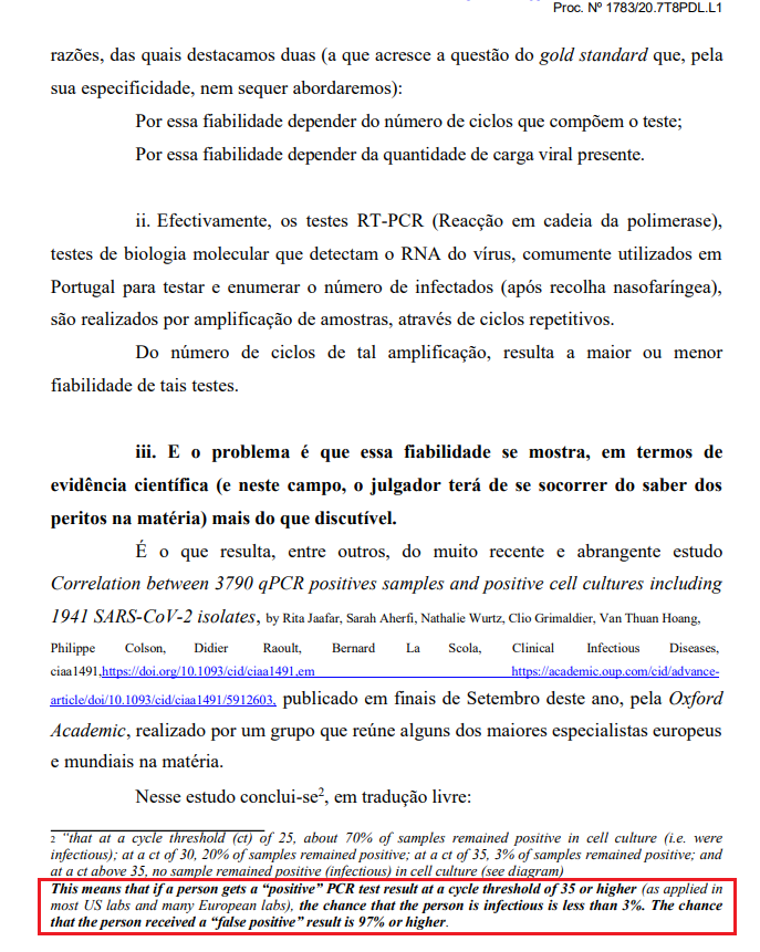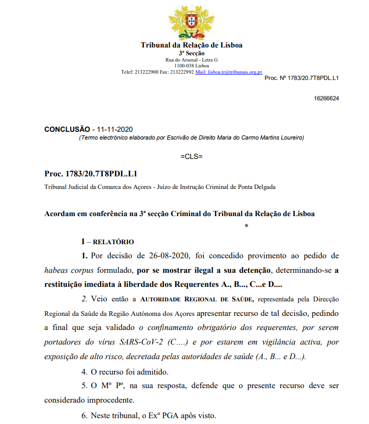 Лиссабонский апелляционный суд Португалии (Tribunal da Relação de Lisboa) принял интересное решение по делу 1783/20.7T8PDL.L1. Четыре португальца были принудительно помещены в двухнедельную изоляцию после положительного ПЦР-теста на коронавирус по решению Регионального управления здравоохранения. Эти лица обжаловали такое решение, и суд признал незаконной их изоляцию на основании ПЦР-теста.