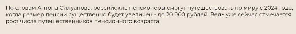 Наши власти не лыком шиты и рассказывали нам "сказки" про то, как пенсионеры заживут припеваючи с новыми пенсиями. Причем не только заживут, но еще и смогут путешествовать.