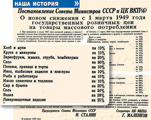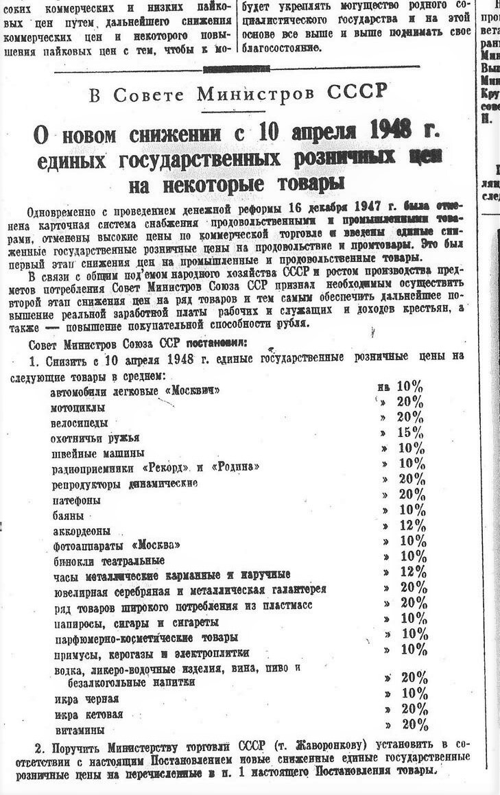 Уже через два с половиной года после окончания Великой Отечественной войны, в декабре 1947 года в СССР была осуществлена денежная реформа, отменены карточки на продовольственные и промышленные товары, введены единые сниженные государственные розничные цены на товары массового потребления. На этом, первом этапе снижения цен удешевление товаров массового потребления по одной лишь государственной розничной торговле составило в течение года 57 миллиардов рублей. К тому же снижению цен на колхозном и кооперативном рынке были снижены цены на сумму 29 миллиардов рублей. Всего потери бюджета в 1947 году от снижения розничных цен составили 86 миллиардов рублей. Эта сумма составляла собою чистый убыток для государственного бюджета, который был покрыт благодаря росту производительности труда, увеличению производства товаров массового потребления и снижению себестоимости продукции.