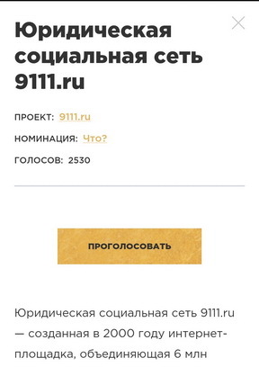 В этом году наш любимый сайт «Юридическая социальная сеть 9111.ru» принимает участие в народном голосовании за «Премию рунета».