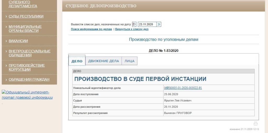 Скрин с сайта суда. Приговор пока не опубликован. Ссылка на дело, если кто захочет почитать приговор.