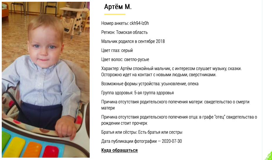 У Артёмка мама умерла и у него не осталось никого из близких, кто бы прикрыл бы его своим крылом, оберегая от невзгод и ненастья... Нет близкого человека, кому бы он сказал слово "мама"... Очень хочется надеяться, что малыш приобретёт приёмных родителей, которые будут ег любить и помогать справляться с недугами его здоровья...
