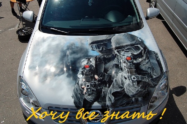 Аэрография - нанесение на автомобиль графического рисунка - очень популярна в последнее время среди автолюбителей независимо от пола. Вкусы клиентов самые разнообразные: от простых рисунков в стиле фэнтези до различных сюжетов из истории. Например, на дорогах можно увидеть автомобили с нанесенными изображениями воинов или самураев.