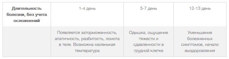 Типичная симптоматика, которая наблюдается на 5-7 день после инфицирования, может продлеваться на неопределенный период. Особенно если развивается такое осложнение, как дыхательная недостаточность.