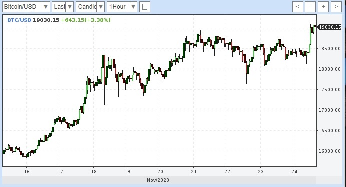Курс биткоина на криптобирже Binance во вторник, 24 ноября, впервые с декабря 2017 года поднялся выше уровня 19 000 долларов. В 14-00 мск криптовалюта торговалась возле отметки в 19 050 долларов за единицу.