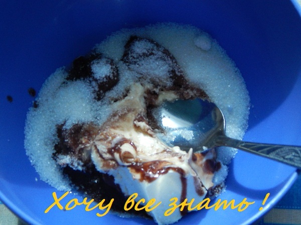 Подтопленное масло смешиваем с сахаром. Должна быть равномерная масса.