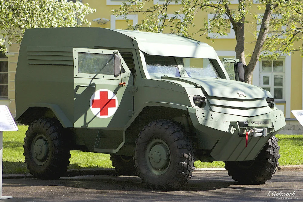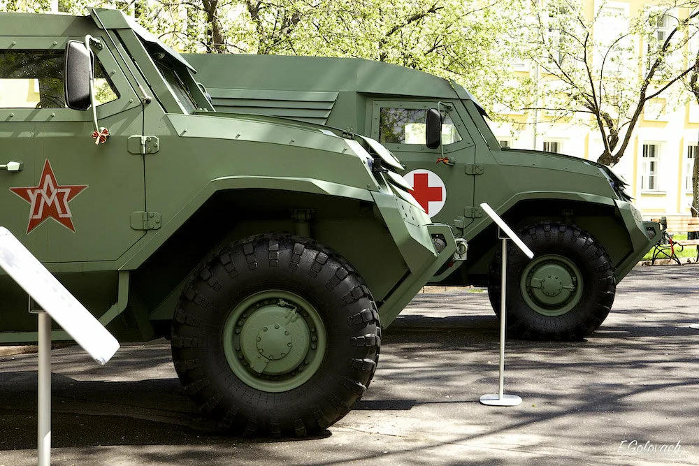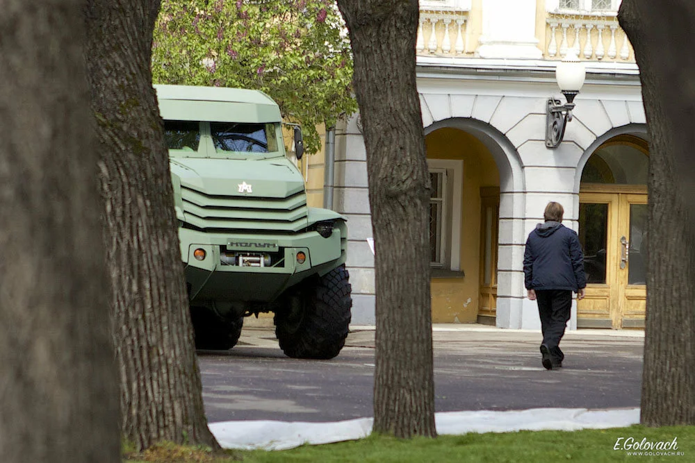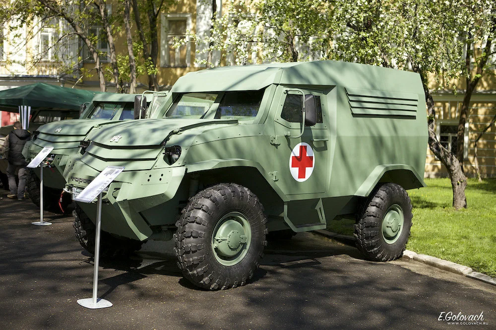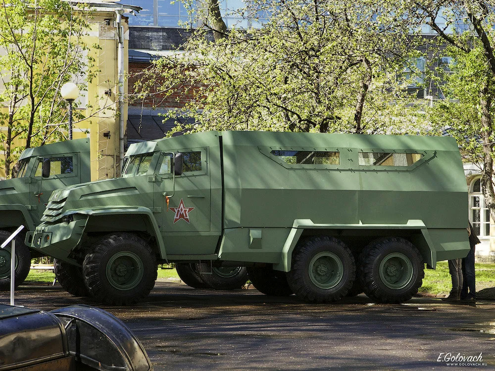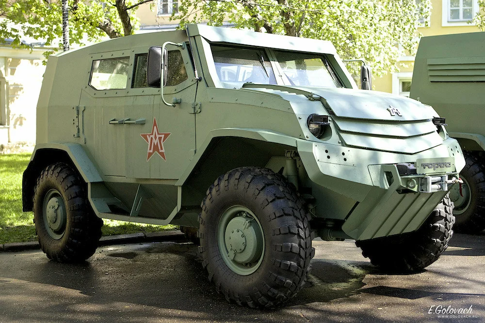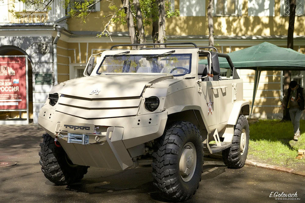 Представлены пять военных машин футуристического вида – грузовики «Колун», созданные на основе ЗИЛ–131, и внедорожники «Торос».