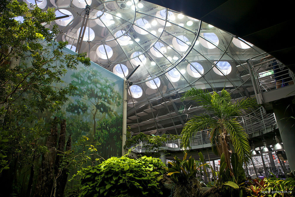 Крыша биодома, под ней огромный шар с климатическими зонами.