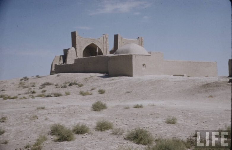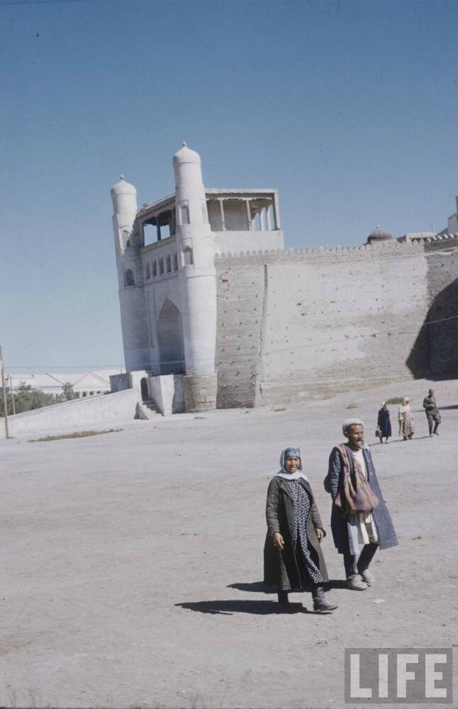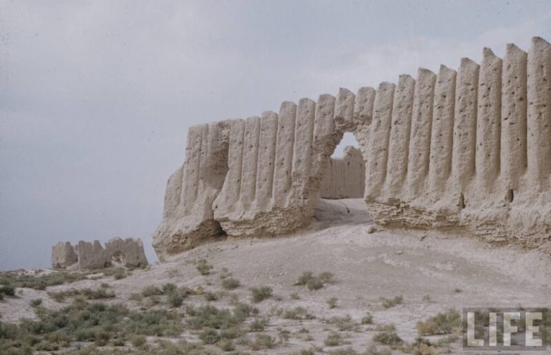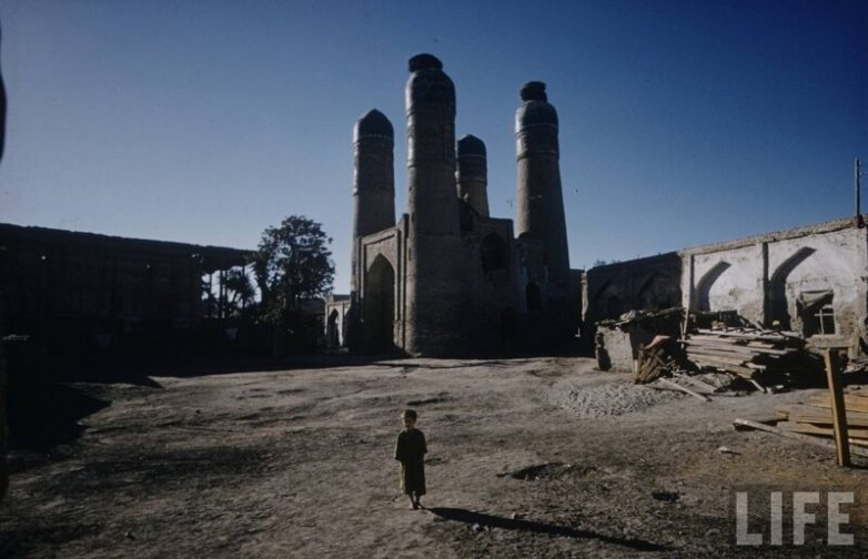 Это, в первую очередь, относится к фотографии с проломом в стене, очень напоминает город Мевр в Туркменистане. Следующая после «стен в пустыне» фотография Бухары, медресе «Чор-Минор» с мальчиком на переднем плане.