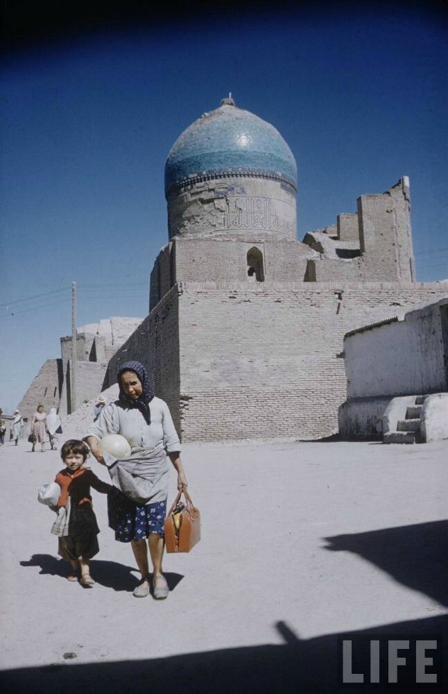 В общем тут очень много фотографий Бухары, например, дворик с Лениным — это двор медресе Саид Алимхана, купол мечети Калям (женщина с ребенком несут дыню).