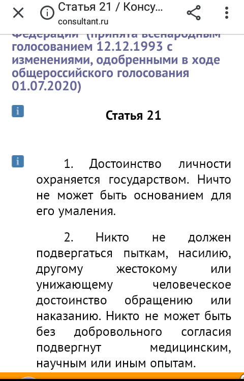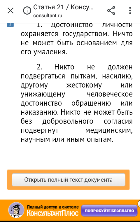 Про «медицинские и научные опыты» придумал и дописал автор. В Конституции ст 21 такого нет и быть не может - от слова совсем.
