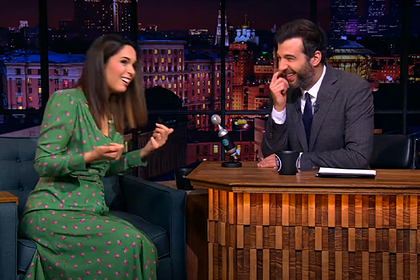 Ведущий Иван Ургант пошутил о том, что следующим этапом в карьере Ахмедовой станет приглашение в программу «Мужское/Женское» в качестве эксперта. Затем он перечислил несколько реальных тем передачи и предложил звезде ТНТ высказаться.
