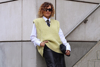 Помимо этого, модный блогер Рэния Джаз опубликовала кадр, на котором она объединила упомянутый аксессуар с белой рубашкой, черной кожаной юбкой длины миди и салатовым вязаным жилетом.