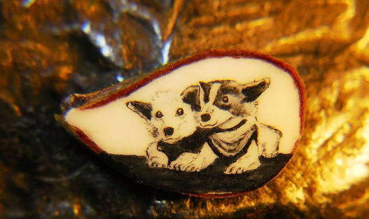 Изображение Белки и Стрелки на срезе яблочной косточки.