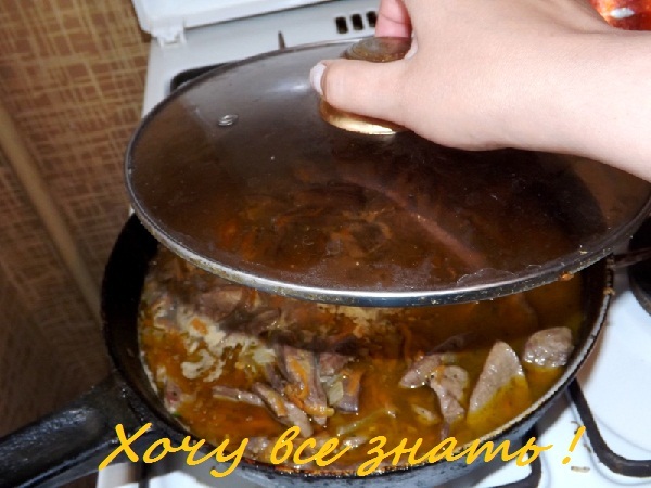 Последним завершающим моментом приготовления гуляша из печенки индюка станет тушение блюда. Сразу после закипания юшки сковородку накрыть крышкой, убавить до минимума огонь и потомить 5-7 минут не более. Для тушения печеночный гуляш можно переложить со сковородки в чугунную жаровню, а можно оставить прямо в той посуде, где изначально готовился.