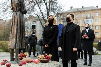 Зеленский почтил память жертв голодомора у памятного знака на Михайловской площади, установив композицию из пшеничных колосьев и калины. Затем он отправился в Национальный музей, где вместе с другими участниками церемонии почтил минутой молчания погибших.