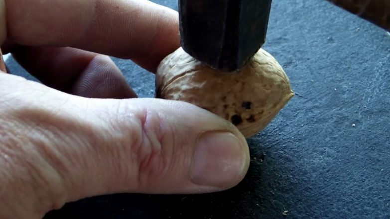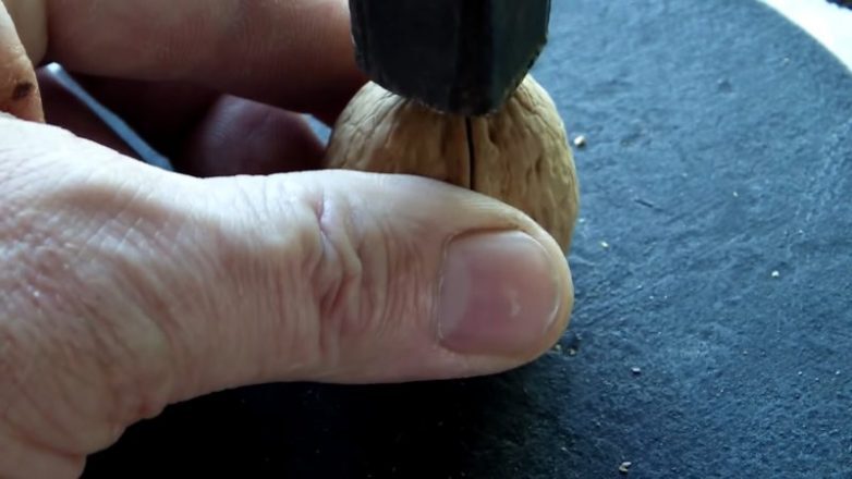 Для этого орех нужно положить на идеально ровную и устойчивую поверхность. Первый легкий удар молотком нужно сделать по цельной скорлупе, а не там, где есть трещина.