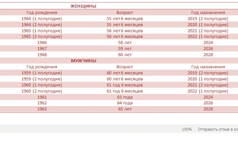 Периоды выхода на пенсию в табличном варианте и в примерах
