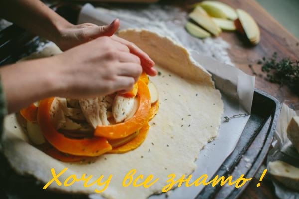 После того, как вы подготовили начинку, а ваше тесто простояло в холодильнике полчаса, можете приступать к созданию вашего пирога. На посыпанной мукой доске раскатайте тесто в круг. Выкладывайте начинку слоями – сначала тыква, потом яблоки, потом сыр, затем немного соли и перца, а затем повторяйте последовательность заново. Небольшое пространство по краям придется оставить – из него вы сделаете бортики для вашего пирога. После того, как у вас закончится начинка, и вы слепите из теста бортики, смажьте пирог яйцом и поставьте в духовку на сорок минут.