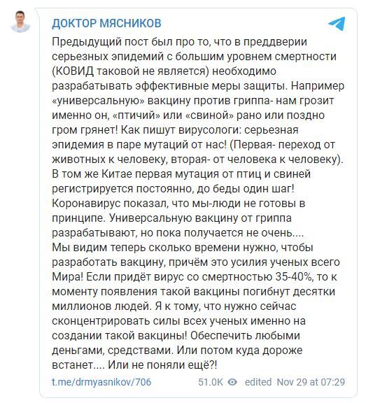 «Нам грозит именно он, „птичий“ или „свиной“ рано или поздно гром грянет!» — написал Мясников. — «Как пишут вирусологи: серьезная эпидемия в паре мутаций от нас».