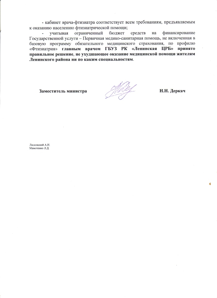 В свою очередь в Минздраве ответили, что туберкулёз не входит в список услуг медицинской помощи, которые можно получить по программе ОМС. Также в Минздраве отметили, ссылаясь на ограниченный бюджет средств на финансирование государственной услуги — первичной медико-санитарной помощи, что главным врачом ЛЦРБ принято правильное решение, не ухудшающее оказание медицинской помощи жителям Ленинского района.