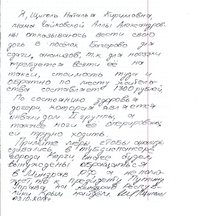 «Нам не понятна позиция руководства тубслужбы, направленная против сельских жителей. Почему сельские жители должны оплачивать дорогостоящее обследование на туберкулёз в различных лабораториях Крыма, включая средства на дорогу в Симферополь, тратя на это не только свои средства, но и время, подвергая риску заражения других людей. Почему жители района лишены возможности обследоваться в Керченском ПТД, где созданы все условия для бесплатного амбулаторного обследования граждан на туберкулёз?», — обращались медработники к руководству республиканского Минздрава. — У нас регулярно возникают конфликты на почве жалоб больных, которые отказываются куда-либо ехать за неимением материальных средств. О какой оплате может идти речь, если это государственная программа по борьбе с туберкулёзом?