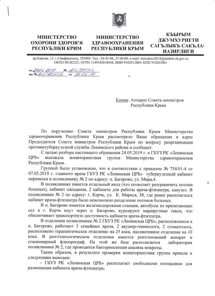 Работники противотуберкулёзной службы Ленинской ЦРБ неоднократно обращались к крымским властям с просьбой сохранить кабинет на базе хорошо оборудованного Керченского противотуберкулёзного диспансера. Медики обращали внимание руководства Минздрава на недопустимость ограничения доступности оказания медицинской помощи жителям и в качестве аргументации своих доводов упоминали государственную программу по борьбе с туберкулёзом.