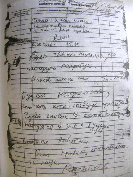 По словам эксперта Дмитрия Власова в своей последней записке Дмитрий Колесников указывал, что после того, как оставшиеся в живых члены экипажа не смогли открыть крышку аварийно-спасательного люка, один из матросов начал выстукивать по контактировавшему с водой люку сигналы SOS. На «Петре Великом» эти сигналы слышали, но приняли их за сигналы с другой субмарины, выдвинув позднее версию, что «Курск» столкнулся с зарубежной подлодкой, вместо того, чтобы развернуть все силы флота на поиск подлодки.