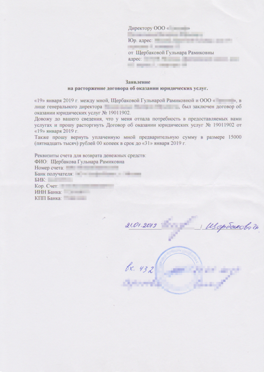 Я была морально не готова снова общаться с Ириной. Поэтому когда в офисе девушка на ресепшене предложила сначала обсудить расторжение с моим юристом, я наотрез отказалась и потребовала зарегистрировать входящий документ.