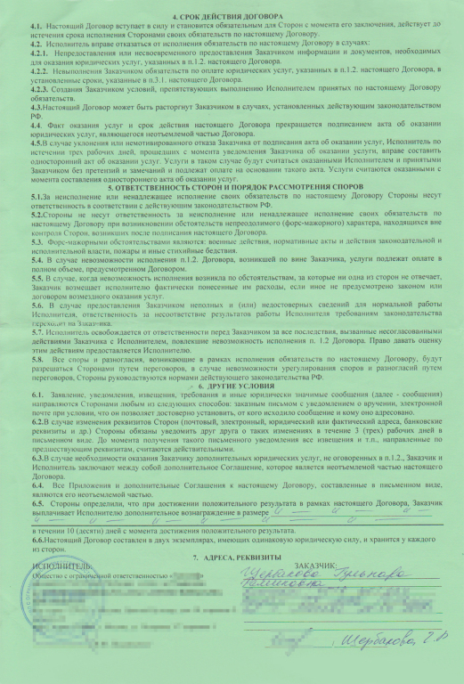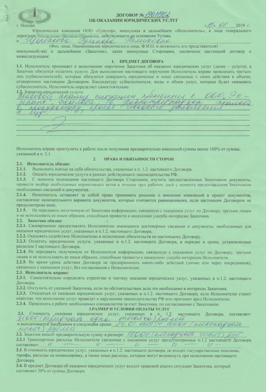 Ирина представилась опытным специалистом, выслушала мою историю, все законспектировала и приступила к своей «миссии». А главная миссия Ирины — заключить договор на оказание платных юридических услуг.