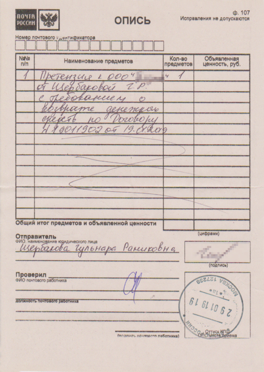 Претензию я отправила заказным письмом с описью и уведомлением на юридический адрес компании. Письмо так никто и не забрал — оно вернулось ко мне со всеми штампами и хранится в нераспечатанном виде на случай, если юристы захотят обратиться в суд и потребовать оставшуюся стоимость работ по договору. Сама готовить иск в суд я не собираюсь — магазин уже выплатил мне компенсацию расходов на юристов. Нераспечатанный конверт подтверждает дату направления претензии на корректный юридический адрес компании. Так как претензия была проигнорирована, суд вряд ли встанет на их сторону.