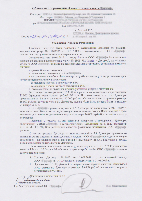 С юристами я все равно решила разобраться. Я даже обрадовалась недобросовестно составленной ими претензии — она дала мне повод предъявить им некачественное предоставление услуг и больше ничего не платить.