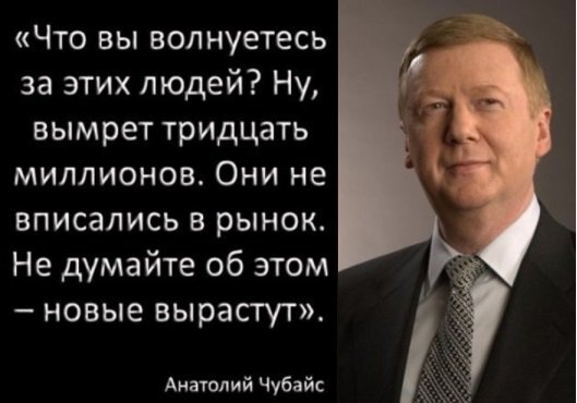 Чего только стоят антинародные высказывания Грефа и Чубайса - это же ужас, хуже фашистов. Они весь народ считают прислугой олигархов, быдлом, которого если и убудет миллионов 30, то ничего страшного... Сейчас все, кто там наверху мечтают только нахапать денег, как можно больше и перекинуть их за рубеж, где живут их семьи, дети, родственники. Доят страну, как хотят... А великий и мудрый делает вид, что ничего этого не замечает.