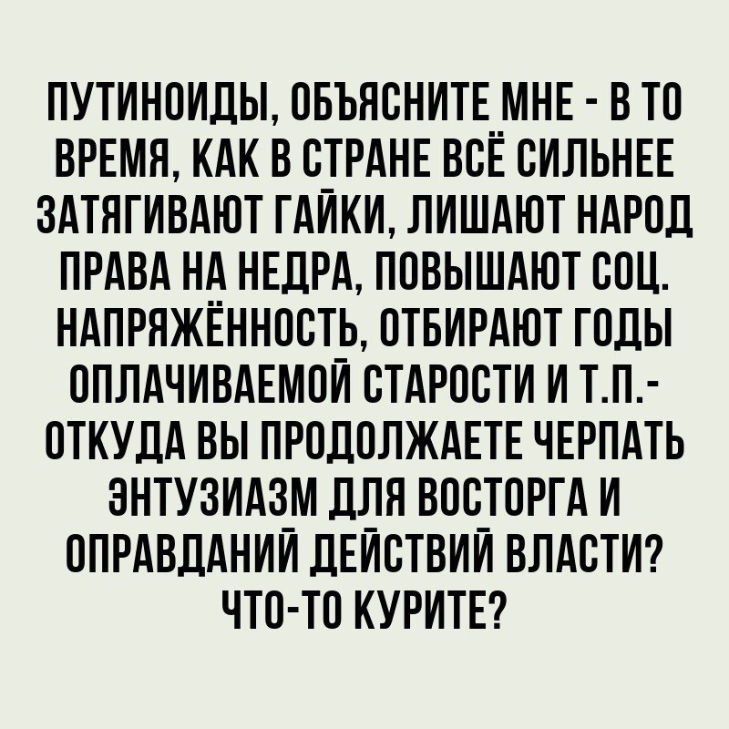 Уважаемый Гнусов А.А. давайте по-порядку. 1. Бедность населения. Если Вы в теме и хоть чуть знаете историю не по знаниям ЕГЭ, то Россия в разные периоды времени никогда не была богата. Я имею ввиду доходы населения. Если Вы говорите о бедности, то не голословно. Дайте ссылки на доходы по регионам и отраслям. На сколько я помню всегда народ жил неважно. Но в холодильниках все было и одевались все нормально. И это было везде. Ни кто не спорит. Мы живем всегда трудно. И в 90-х произошла очередная, как это бывало в России неоднократно, катастрофа. Так дайте определение кто за этим стоит. И не забывайте. Россия-имперская страна с колоссальной территорией. Что бы ее защищать нужны ресурсы и нужно, как не парадоксально звучит, "кормить" своих союзников по миру. Хотя у России всегда были только два их-армия и флот. Что бы жить мирно, надо иметь силу. А это стоит денег. Если не согласны, то никто не мешает уехать в маленькую страну любую. Только мир в этой стране будет зависеть от двух-трех стран мира и как они себя будут вести. Примеров море. Выбирайте любой. 2. Демографический провал. Удивили. Если пишете, то хоть статистику посмотрите. Волна рождаемости еще не затухла с периода ВОВ и на 90-е годы она как раз и попала. Очередной минус синусоиды оттуда. Теперь о смертности. Короновирус - мерзость. Не буду писать что это и почему так произошло. Но смертность в несколько раз...? Извините, голословно. Есть ряд позиций и это открытый доступ, что и как происходит с заболеваниями и кто от чего умирает. Вы не владеете информацией. Поищите для себя данные. И не надо таким образом поднимать себе положительный рейтинг. Вы юрист, так занимайтесь своим делом. Политика, экономика, медицина - не ваши области, где Вы сильны в знаниях. 3. Распил и воровство. Конечно есть и не мало. Происходит на наших глазах передел собственности. Что есть, то есть. Я внимательно слежу за изменениями и в судебной системе, и в правоохранительной. С Вами не согласна. Меняется кое что. Вы, как юрист, должны это знать. У нашей страны ЕСТЬ БУДУЩЕЕ, только надо болтать поменьше и делать побольше каждому на своем месте. Это я уже не совсем Вам пишу. Много эмоций. Болтать много можно и говорить наукообразно. Стоит ли? На скамеечках вроде холодно, да и пол у Вас иной. Решили электронную площадку для этого использовать? Тема для обсуждения не удачна и заявлена поверхносто.