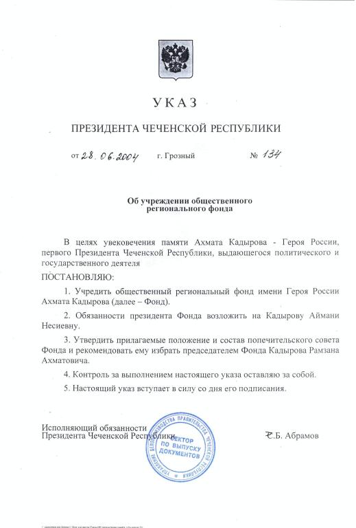 Копия указа президента Чеченской республики - взято с сайта РОФ им. Героя России Ахмата-Хаджи Кадырова